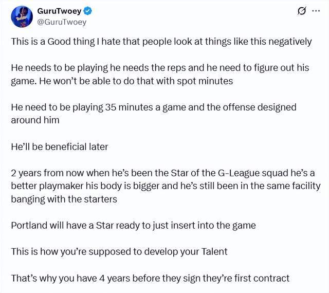 球迷GuruTwoey写道:“这绝对是件好事,我真不喜欢看到大家把这种事往负面想。他现在就该多打球,需要足够的出场次数,也得找到适合自己的比赛节奏。零散的出场时间根本做不到这些。他应该每场打35分钟,球队还得围绕他设计进攻战术。他以后肯定能派上大用场。两年后,等他成为发展联盟球队的核心,传球能力会更强,身体也会更壮,而且这期间他还能一直在开拓者的训练馆里,和主力球员一起训练提升。到时候开拓者就能直接拥有一位随时能上场的球星了。这才是培养新秀该有的方式。不然为什么新秀合同会有4年的时间来用于成长呢?”