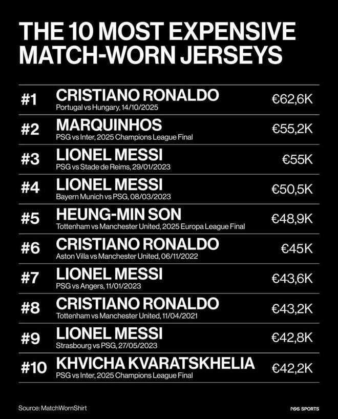 最近Match WornShirt联合NSS Sports发布了一份“历史最贵比赛实战球衣TOP10”榜单,说的不是年薪、不是代言费,而是单件球衣在拍卖平台上的最终成交价。这些球衣都是真正在正式比赛里穿过的实战战袍,一件就能被炒到几十万欧元,最贵的甚至接近63万欧元,上榜的有梅西、C罗、孙兴慜等人。到底是一件球衣本身值这个价,还是被比赛意义和球星光环一起抬上去的,你可以边看排名边自己下判断。
